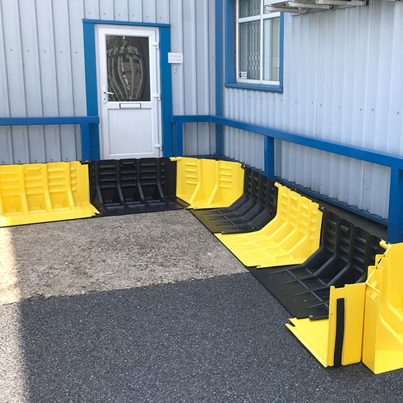 Dieses modulare System leitet Wasser zuverlässig um. Die selbstverankernden Elemente bilden einen 45 cm hohen Damm, der durch das Eigengewicht des Wassers stabilisiert wird.